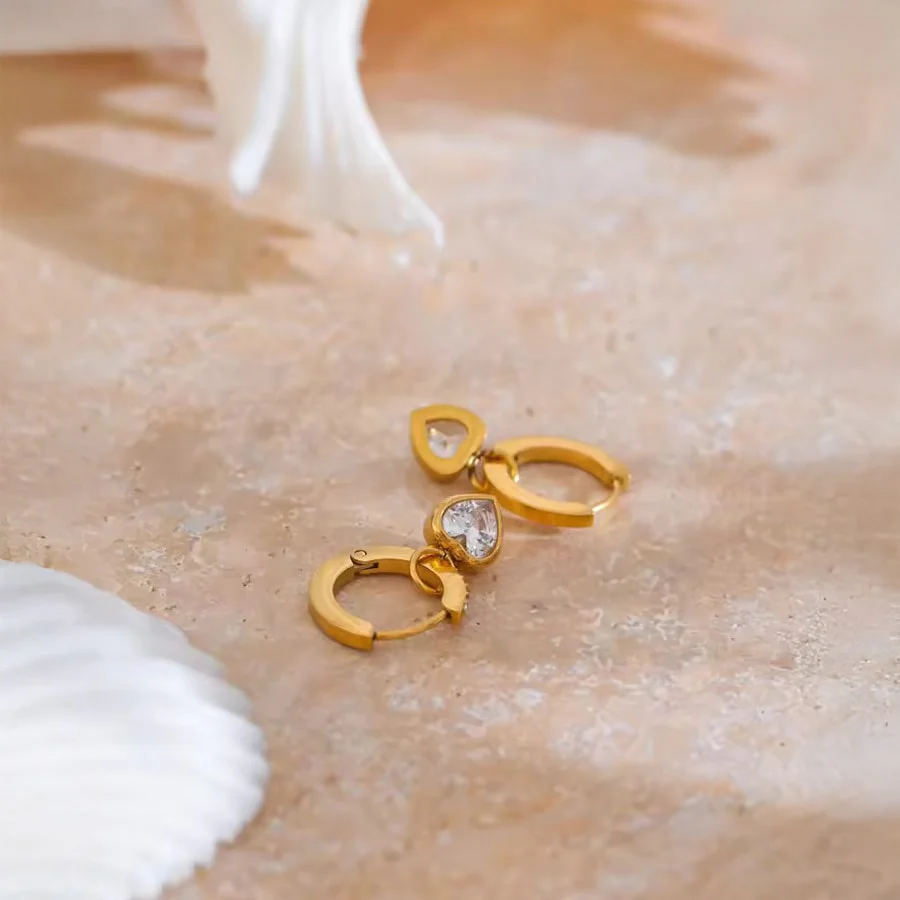 Add a touch of glamour with the Cubic Zirconia Heart Drop Hoop Earrings. Featuring sparkling zirconia hearts, these earrings are coated in 18K Gold PVD for a luxurious look that doesn’t compromise on durability.