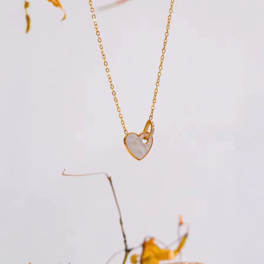 The Shell Zircon Heart Pendant Necklace features an enchanting heart design adorned with sparkling zircon accents and a natural shell finish. Coated in 18K Gold PVD, this necklace is a timeless blend of elegance and durability.